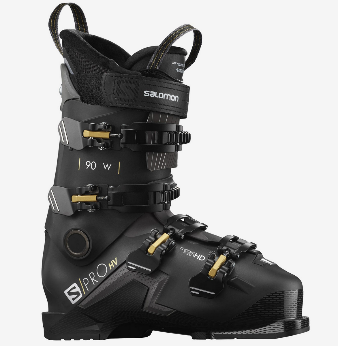 De Salomon S Pro 90 HV is een breder model skischoen voor dames . De stijvere flex van 90 biedt een goede krachtoverbrenging. HV Staat voor High volume. Dankzij de naar de voet te vormen My Custom Fit 3D Performance binnenschoen en de vervormbare Custom Shell buitenschaal kan de pasvorm optimaal naar de voet gevormd worden. Dit geeft een maximale fixatie van de voet zonder in te leveren op comfort. HV staat voor high volume skischoenen. Dit Hv is een bredere variant dan het basis model.